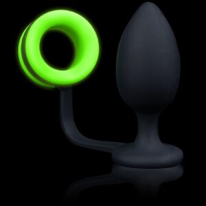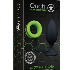 Doublez les plaisirs avec ce plug anal noir et son cockring phosphorescent de la marque Ouch!
