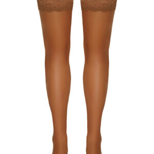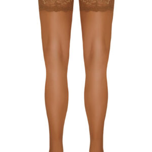Ces bas en voile 20 deniers particulièrement élégants, possèdent une sublime jarretière autofixante en dentelle haute de 14cm qui habille tout le haut de la cuisse et accessoirise la jambe.