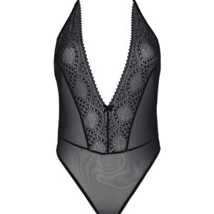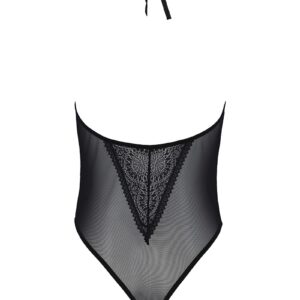 La finition string très échancrée possède une ouverture à l’entre-jambe avec un gousset à agrafes ajustable qui permet de régler la hauteur du body. Un triangle de dentelle pointé vers le bas des reins orne le dos et attire l’attention sur la beauté des fesses.