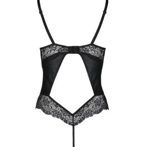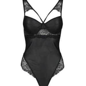 Gainé de faux cuir mat fin et souple, ce body est enrichi d’une dentelle aux motifs fleuris sur les épaules, les hanches et sous la poitrine.