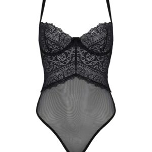 Le bustier en dentelle extensible est sculpté de riches motifs baroques originaux. Son soutien-gorge à armatures met particulièrement bien en valeur les seins, dont le galbe est souligné par la finition ondulée de la dentelle. Le corps de tulle finement ajouré apporte ses effets de transparence si séduisants sur le ventre et dans le dos.