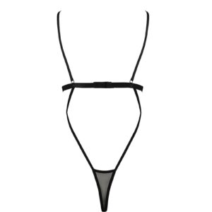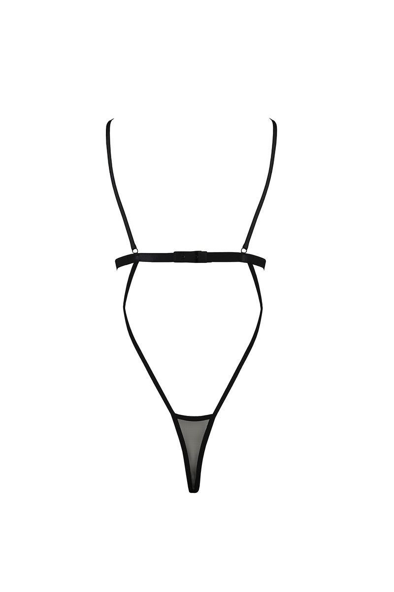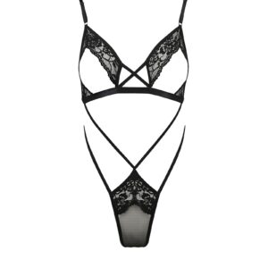 Ce body très sexy, au grand raffinement et légère inspiration bondage, mettra en valeur votre poitrine avec son soutien-gorge ouvert. Le haut et le bord des seins sont soulignés par de la dentelle raffinée et une forme de croix en fine lanière au centre de la poitrine apporte un détail fetish des plus sexy à cette tenue.