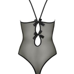 Body sensuel en tulle et dentelle, structuré devant par des découpes qui mettent en valeur les lignes harmonieuses du buste, et décoré dans le dos par deux noeuds satin qui soulignent le point central de jonction des bretelles, et les ouvertures en oeil aux effets très sexy.