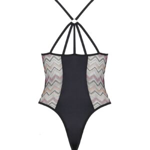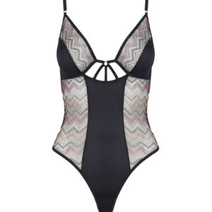 Joliment coupé et riche de détails et de fantaisies, le body est une harmonie de maille noire aux reflets satinés, et de tulle brodé de motifs colorés en chevrons, soulignés par un fil doré.