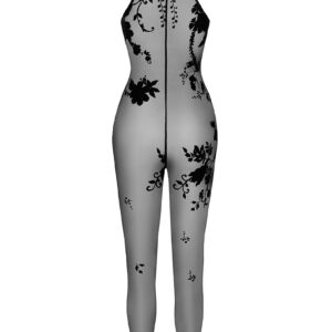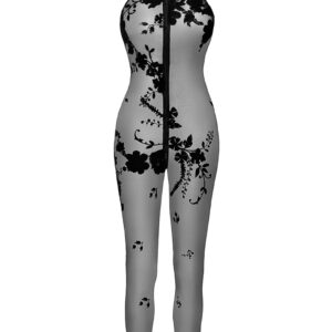 Remarquable avec son corps de tulle transparent floqué d’un motif de fleurs élégant et féminin, cette combinaison clubwear est fendue d’un double zip pour vous permettre toutes les audaces d’ouvertures coquines.