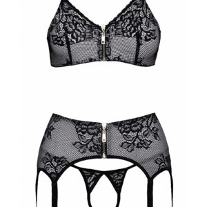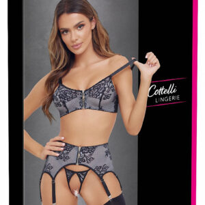 Cet ensemble coquin Cotelli Lingerie est composé d’un soutien-gorge et d’un porte-jarretelles fermés devant par un zip chromé et des attaches à agrafes derrière. Le string vertigineusement ouvert et totalement assorti complète l’ensemble.