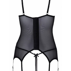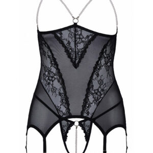 Le corps de la guêpière en fine résille et dentelle extensibles, possède une fermeture à agrafes dans le dos réglable sur deux positions. Quatre bretelles réglables permettent de fixer vos bas (non fournis). Les seins nus sont soulignés par des rangées de perles qui cerclent les seins joliment mis en valeur.