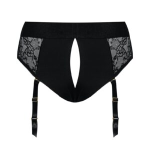 A la fois lingerie sexy et sextoy, le harnais gode-ceinture Diva a l’apparence d’une culotte fendue sur les fesses en microfibre et dentelle, équipé d’un porte jarretelles intégré.