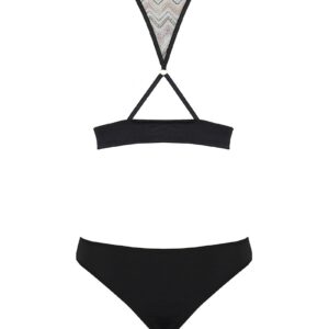 Joliment coupé et riche de détails et de fantaisies, l’ensemble est une harmonie de maille noire aux reflets satinés, et de tulle brodé de motifs colorés en chevrons, soulignés par un fil doré.