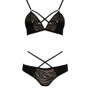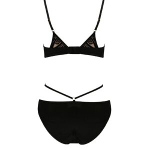 La dominante noire de l’ensemble est égayée par des pièces de tulle beige floqué de noir qui décorent les bonnets, le pubis, et forment deux triangles à lextrémité des bretelles dans le dos.