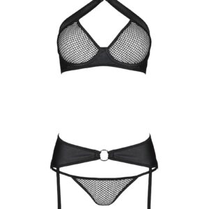 Savourez un style de lingerie sexy et provocant avec l’ensemble résille et faux cuir Amanda par la marque Passion, composé d’un string, d’un porte-jarretelles et d’un soutien-gorge.