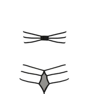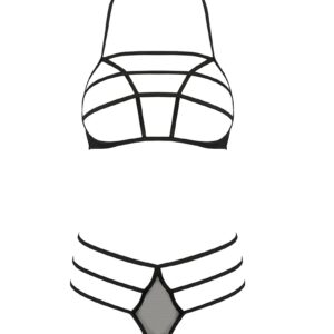 Cette tenue en fines lanières noire et tulle se compose d’un soutien-gorge et d’un string très sensuels.