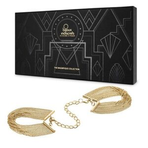 La marque Bijoux Indiscrets propose au travers de sa collection “Magnifique” une paire de Bracelets / Menottes ajustables en chainettes métalliques dorées.
