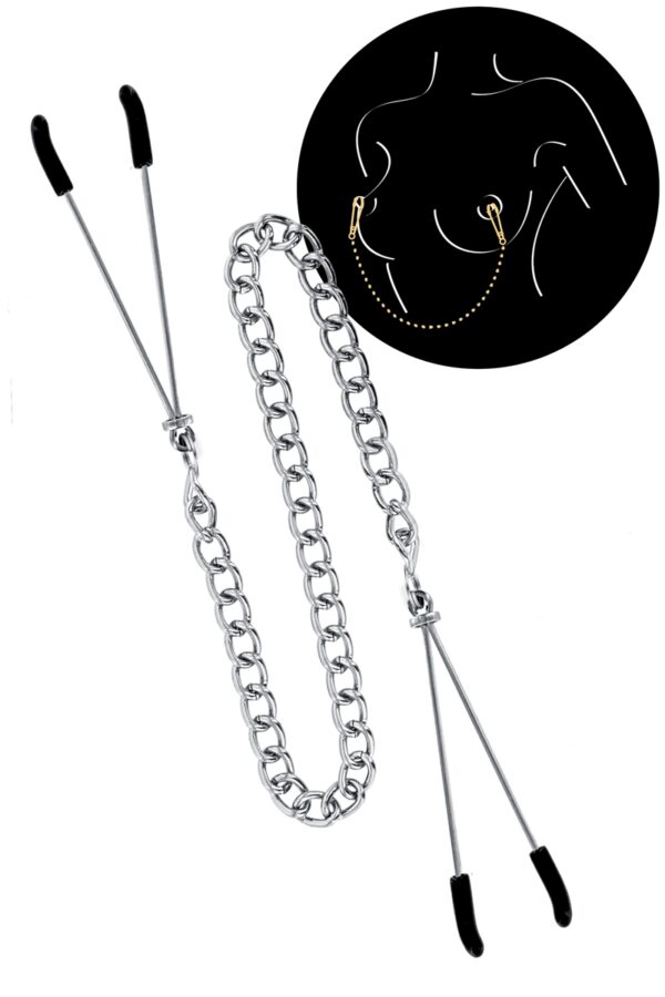 Deux pinces à seins réglables, fixées à une chainette en acier argenté, pour stimuler les tétons de votre partenaire, par Sweet Caress.