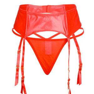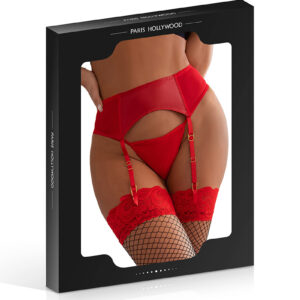 Ensemble porte-jarretelles sexy rouge en wetlook équipé de 4 jarretelles ajustables et son string assorti, par Paris Hollywood.