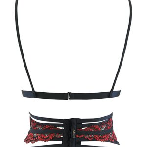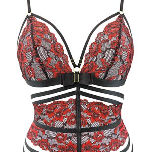 Osez une lingerie provocante et inventive en dentelle noire et rouge, qui marie un soutien-gorge triangle délicat et un serre-taille somptueux.