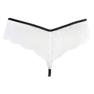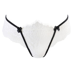 Délicate composition de deux dentelles blanches soulignée d’un fin élastique noir, ce string sensuel Axami est une lingerie féminine au charme savoureux.