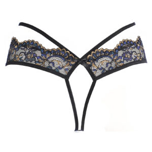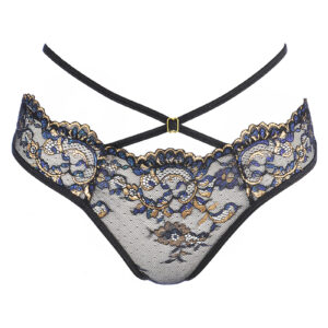 String raffiné et élégant, ce modèle en tulle noir brodé de motifs bleu et or est particulièrement charmant.