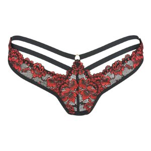 Joliment échancré derrière pour mettre les fesses en valeur, le string est illuminé devant par sa dentelle illuminée de motifs rouges éclatants.