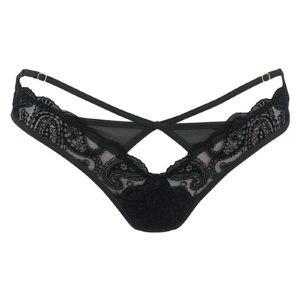 Ce string sexy est fabriqué en tulle noir recouvert de dentelle très douce floquée dun motif fleuri. Un jeu de sangles réglables en V sur le devant apporte une touche de fantaisie à ce string sexy. Les éléments de réglage en métal sont tous dorés.