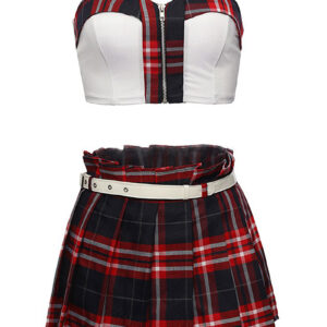 Ce déguisement d’étudiante sexy est composé de 6 pièces : un joli top bustier qui met en valeur la poitrine, une mini-jupe plissée à carreaux et ouverte, une paire de fausses lunettes, un tour de cou cocarde avec son écusson d’étudiante, un string et une jolie ceinture blanche.