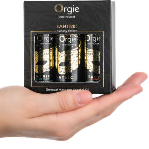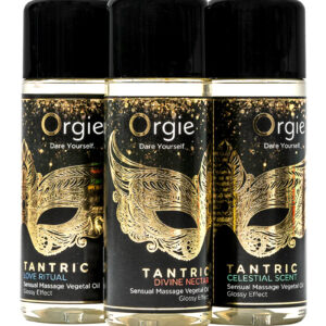 La marque Orgie propose le mini coffret de 3 huiles de massage sensuel de la collection Tantric.