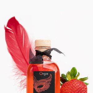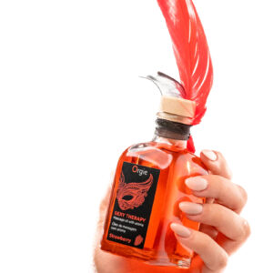 Sexy Therapy Straberry, une huile de massage embrassable parfumée à la fraise, accompagnée d’une plume pour booster les sensations.