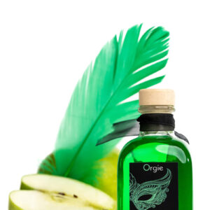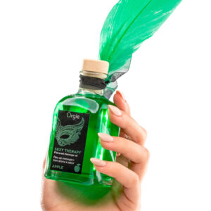 Sexy Therapy Apple, une huile de massage embrassable parfumée à la pomme, accompagnée d’une plume pour booster les sensations.