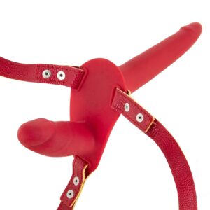 Double gode ceinture rouge de la marque Fetish Tentation pour jouir du plaisir de la pénétration réciproque en couple homme / femme ou femme / femme.