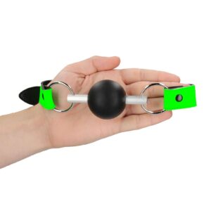 Bâillon boule qui brille dans l’obscurité, ajustable, haute qualité, en cuir reconstitué et métal, proposé par la marque Ouch!