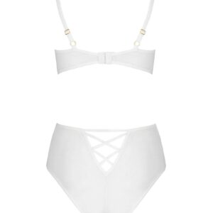 Taille haute et très structurée avec ses jeux de lanières croisées qui s’ouvrent sur les cotés du pubis et au centre des fesses, la culotte blanche est en parfaite harmonie.