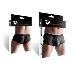 La marque Européenne Regnes Fetish Planet vous propose ce superbe boxer en maille fine et tissu noir effet wetlook brillant. A lavant, la coque est fabriquée en tissu wetlook, elle est rehaussée de large coutures pour un effet plus massif.