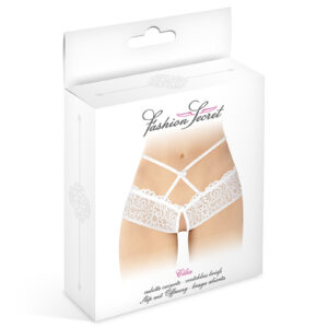 La culotte ouverte Célia blanche est incroyablement coquine avec sa coupe taille “très” basse, son ouverture d’avant en arrière et ses lanières croisées qui soulignent la nudité du bas ventre et du haut des fesses.