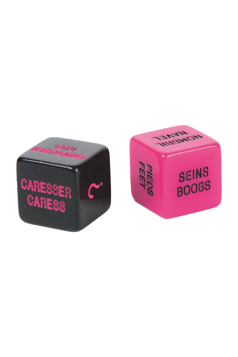 1 Paire de dés coquins: l’un est noir et vous propose des gages tels que caresser, embrasser, surprise et autres. L’autre est rose et désigne des régions de votre anatomie – les seins, les pieds, la bouche A vous de laisser jouer votre imagination.