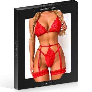 Offrez-vous le summum du glamour et de l’audace avec cet ensemble 3 pièces en dentelle rouge Paris Hollywood.