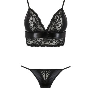 Le soutien-gorge de type bralette en dentelle fleurie et tissu léger effet vinyle noir, apporte du maintien tout en sublimant votre poitrine. Du vinyle brillant entoure la poitrine et une bande passant sous les seins et dans le dos soutient la poitrine tout en donnant de la singularité à ce soutien-gorge sexy. Un petit nud entre les seins attire le regard sur cet atout.