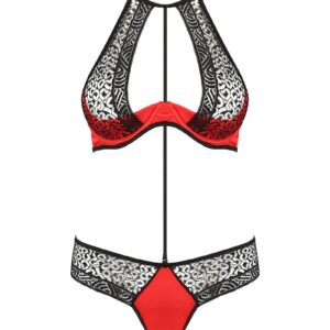 Exprimez votre sensualité dans cet ensemble de lingerie soutien-gorge et string en dentelle noire et tissu effet satin rouge de la marque Passion.