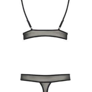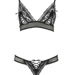 Sexy de dos avec son délicieux triangle de tulle qui s’immisce dans la raie des fesses, l’ensemble est particulièrement séduisant devant avec ses laçages qui fendent la dentelle à la base des bonnets triangle et sur le pubis.