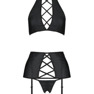 Ensemble trois pièces de lingerie sexy en faux cuir noir Nancy, une tenue érotique féminine et provocante par la marque de lingerie Passion.