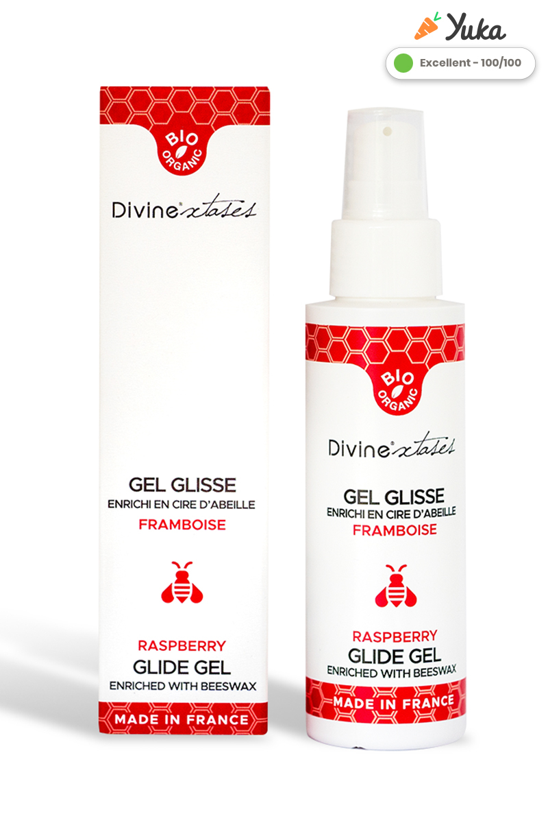 Lubrifiant intime aromatisé à la framboise, 100% bio, comestible, fabrication 100% française, par Divinextases.