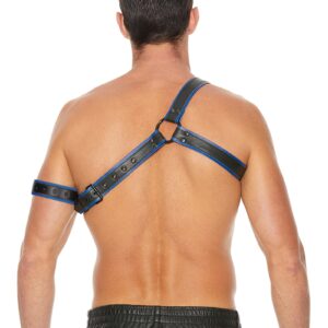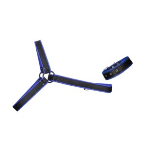 Composé de solides sangles réglables en cuir bleu surpiqué de cuir noir, le harnais “Gladiator Harness” convient à la majorité des hommes. Il se ferme grâce à une boucle solide dans le dos tandis qu’un large anneau sur le côté droit de la poitrine permet dy attacher facilement une laisse, des cordes, des chaînes, des menottes, ou tout ce que vous souhaitez.
