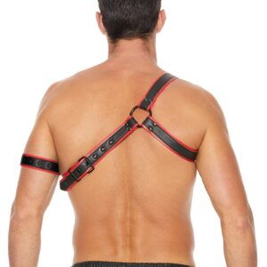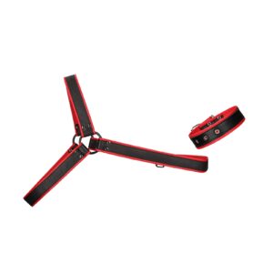 Composé de solides sangles réglables en cuir rouge surpiqué de cuir noir, le harnais “Gladiator Harness” convient à la majorité des hommes. Il se ferme grâce à une boucle solide dans le dos tandis qu’un large anneau sur le côté droit de la poitrine permet dy attacher facilement une laisse, des cordes, des chaînes, des menottes, ou tout ce que vous souhaitez.