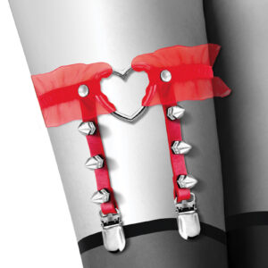 La marque Bijoux pour toi présente cette magnifique jarretière rouge réglable de type BDSM, avec 1 cur argenté en métal sublimé par 2 lanières en simili cuir avec rivets en pointe et 1 lanière avec décoration en tulle.