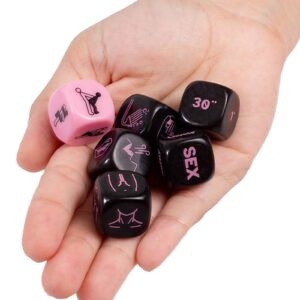 Le jeu contient 6 dés, 5 dés noirs (parties du corps, lieux de la maison, moment où l’action doit être réalisée, action à réaliser et comment la réaliser) et 1 dé rose, qui contient les postures du Kamasutra.