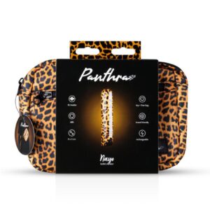Avec le mini vibro Nayo, la marque Panthra propose un puissant petit stimulateur multi-fonctions décoré façon brousse et accompagné de son sac de transport assorti.