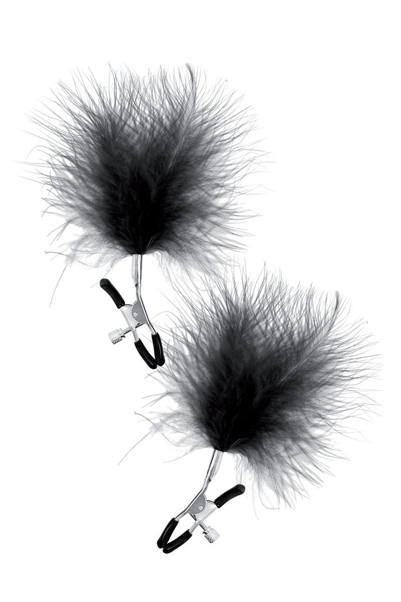 Deux pinces à seins à pression réglable avec un petit plumeau noir au bout, pour stimuler les tétons de votre partenaire et décorer sa poitrine, par Sweet Caress.