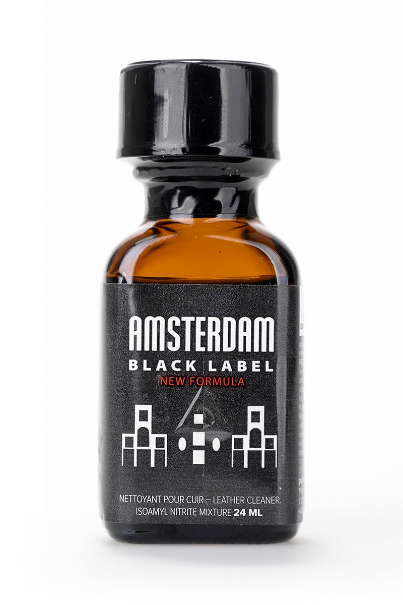 Arôme liquide Amsterdam Black label, euphorisant sexuel extra fort à base d’Isoamyl nitrite (un composant chimique très fort et qui dure plus longtemps), en flacon de 24 ml.