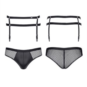 Vous aimez porter des bas mais voulez garder votre part de masculinité? La marque européenne Regnes Fetish Planet à développé pour vous cet ensemble de deux pièces composé dun slip en résille et tissu effet wetlook et dune ceinture porte-jarretelle fabriquée en tissu élastique.