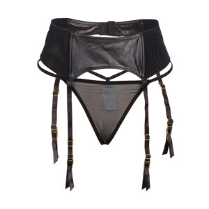Osez ce porte-jarretelles avec empiècements en wetlook noir très sexy et chic.