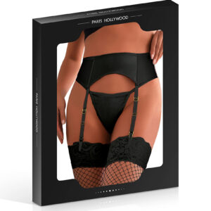 Ensemble porte-jarretelles sexy noir en wetlook équipé de 4 jarretelles ajustables et son string assorti, par Paris Hollywood.